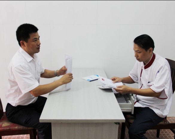 广西华南烹饪学校就业指导中心朱主任和荔园山庄餐饮部郭总交流当中