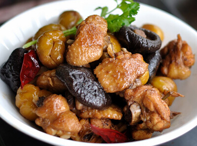 材料:鸡肉(适量)、栗子(适量)、香菇(适量)、精盐(适量)、老抽(适量)、姜(适量)、料酒(适量)